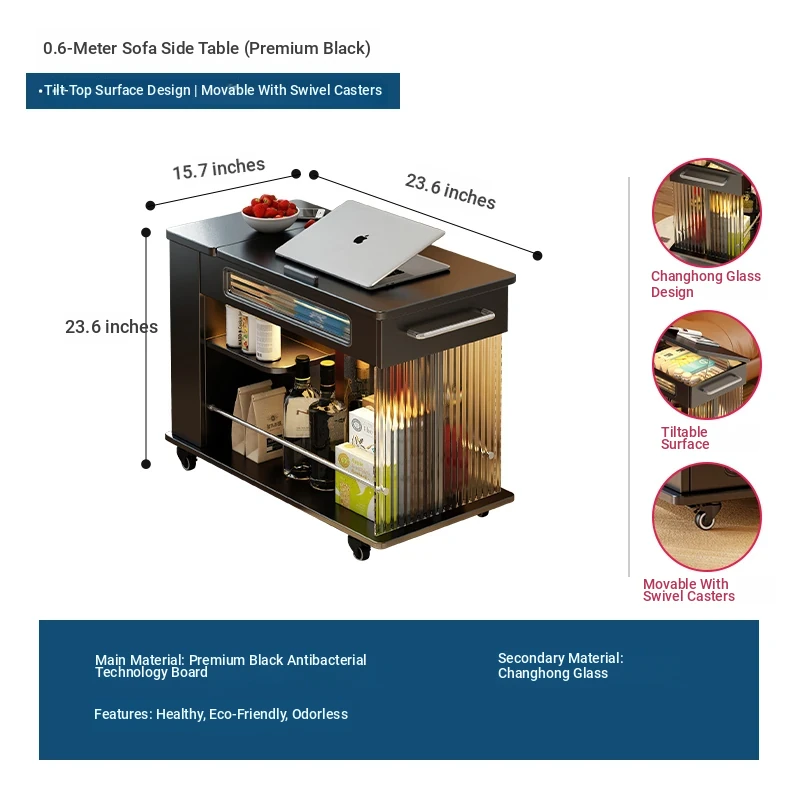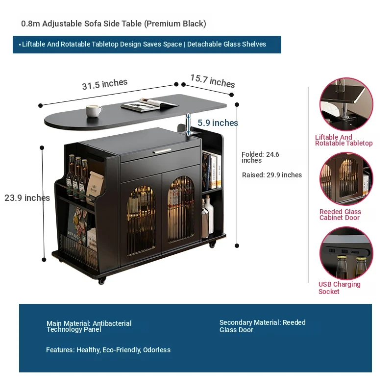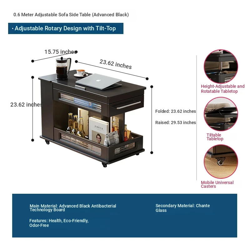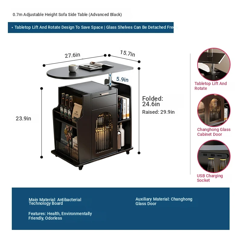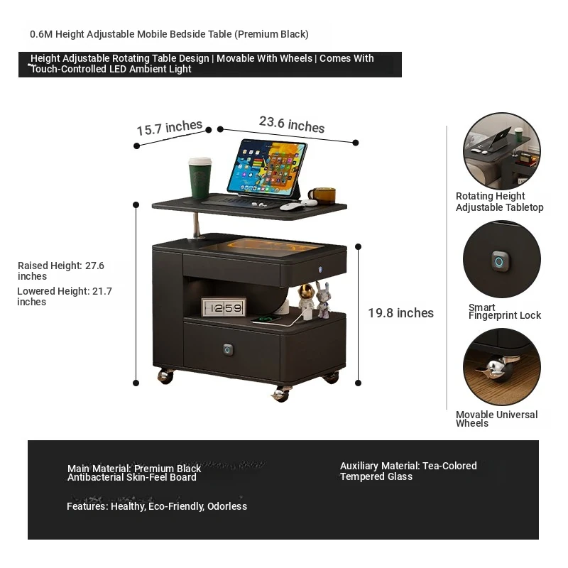 19.69in Multifunctional Adjustable Side Table [Black Antibacterial Environmental Protection Board + Liftable Rotate Desktop + Universal Wheel + USB Charging + Lamp Band + Fingerprint Lock]]
