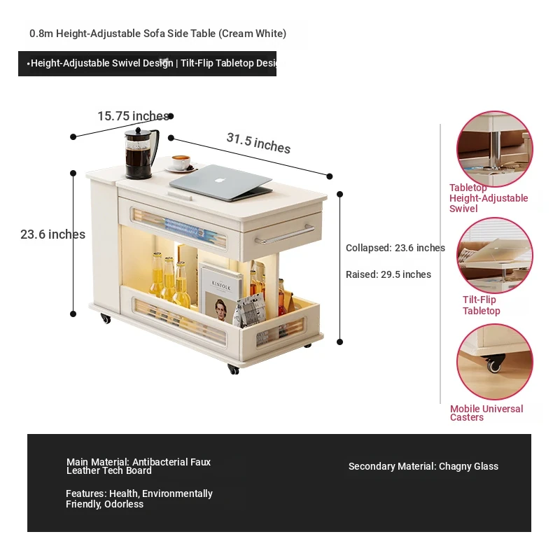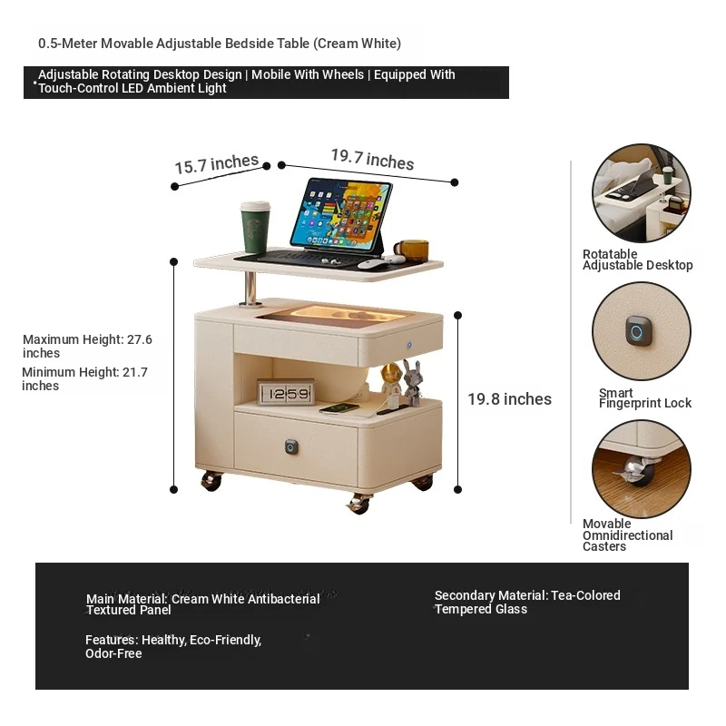 19.69in Multifunctional Adjustable Side Table [Cream White Skin Sense Leather Pattern + Lifting Rotate Desktop + Universal Wheel + USB Charging + Lamp Band + Fingerprint Lock]]