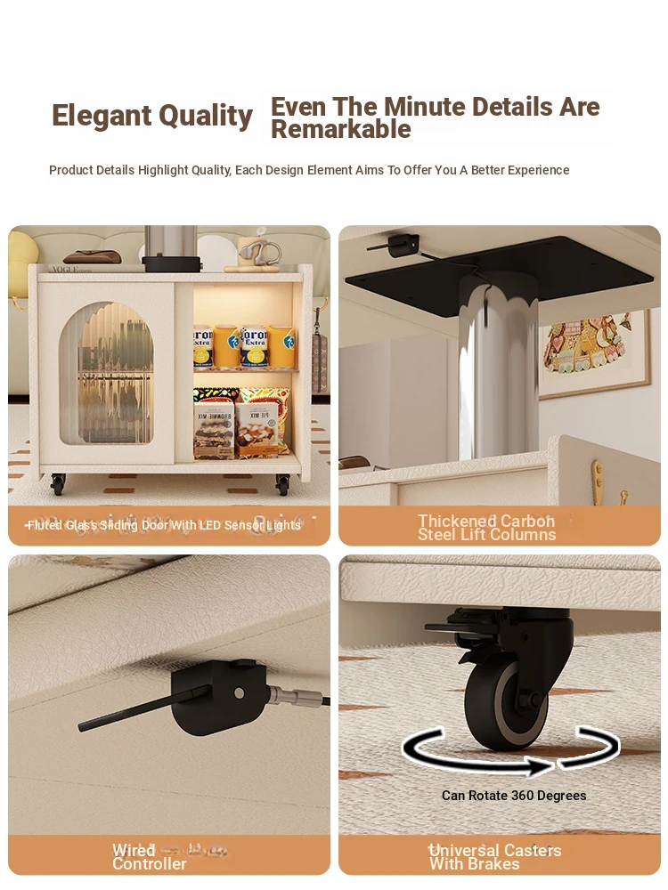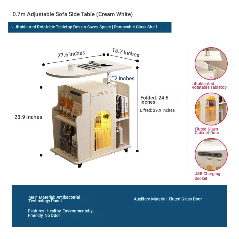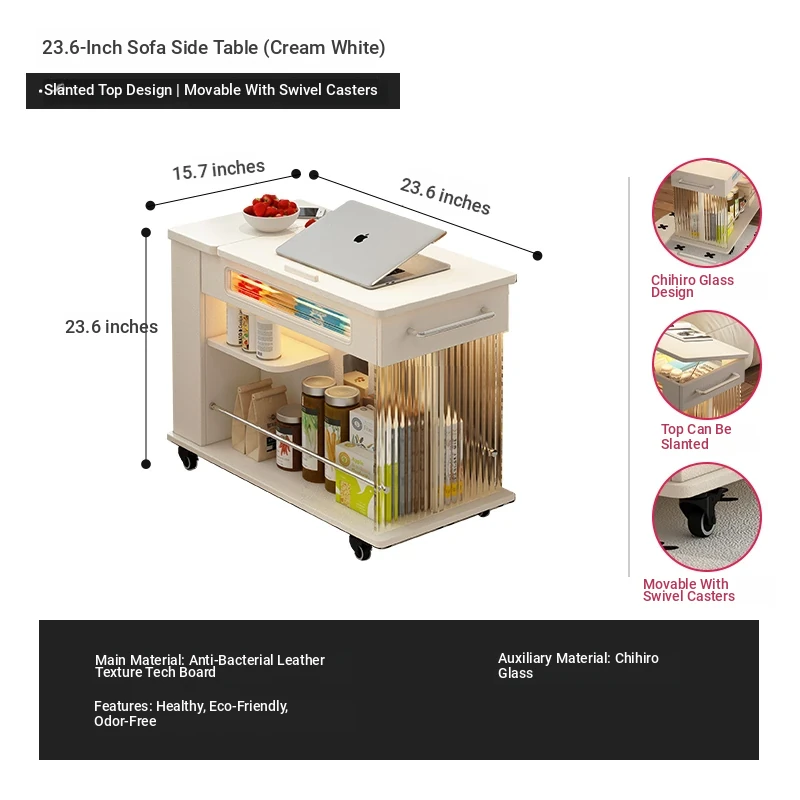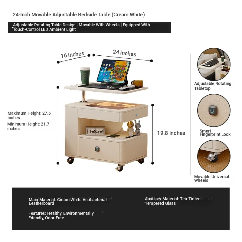 23.62in Multifunctional Adjustable Side Table [Cream White Skin Sense Leather Pattern + Lifting Rotate Desktop + Universal Wheel + USB Charging + Lamp Band + Fingerprint Lock]]