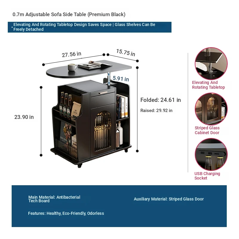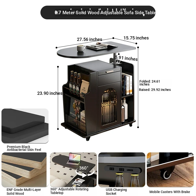 27.56 in solid wood Adjustable sofa side table [five anti-bacterial Classy Black]]