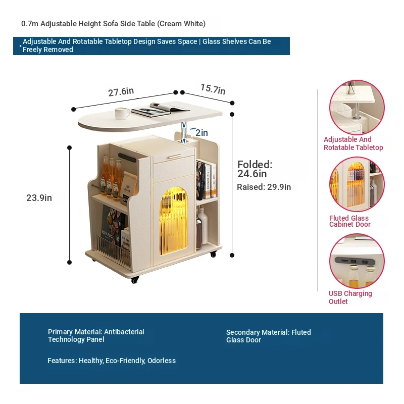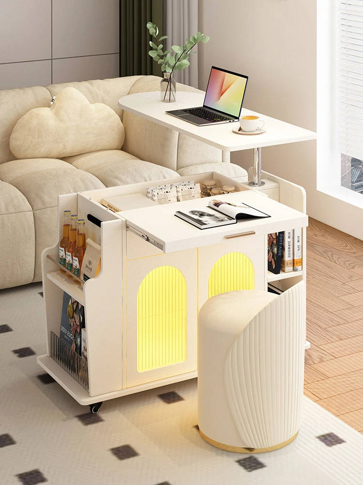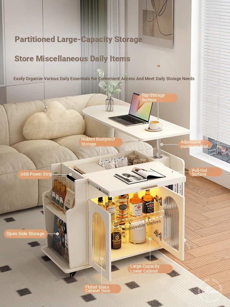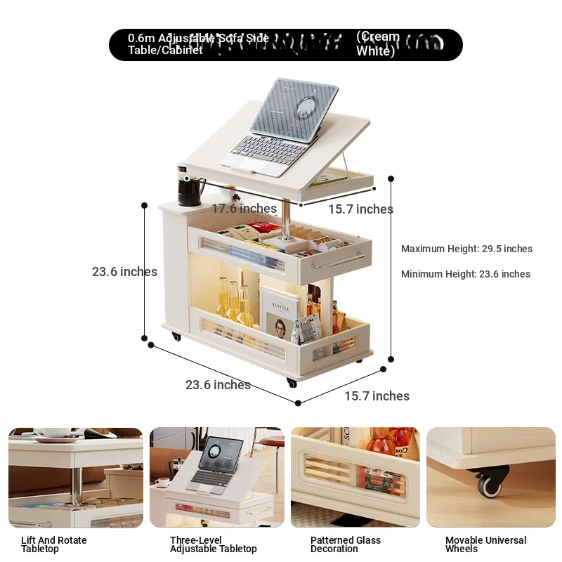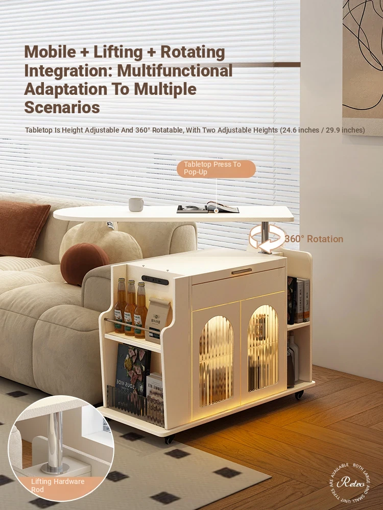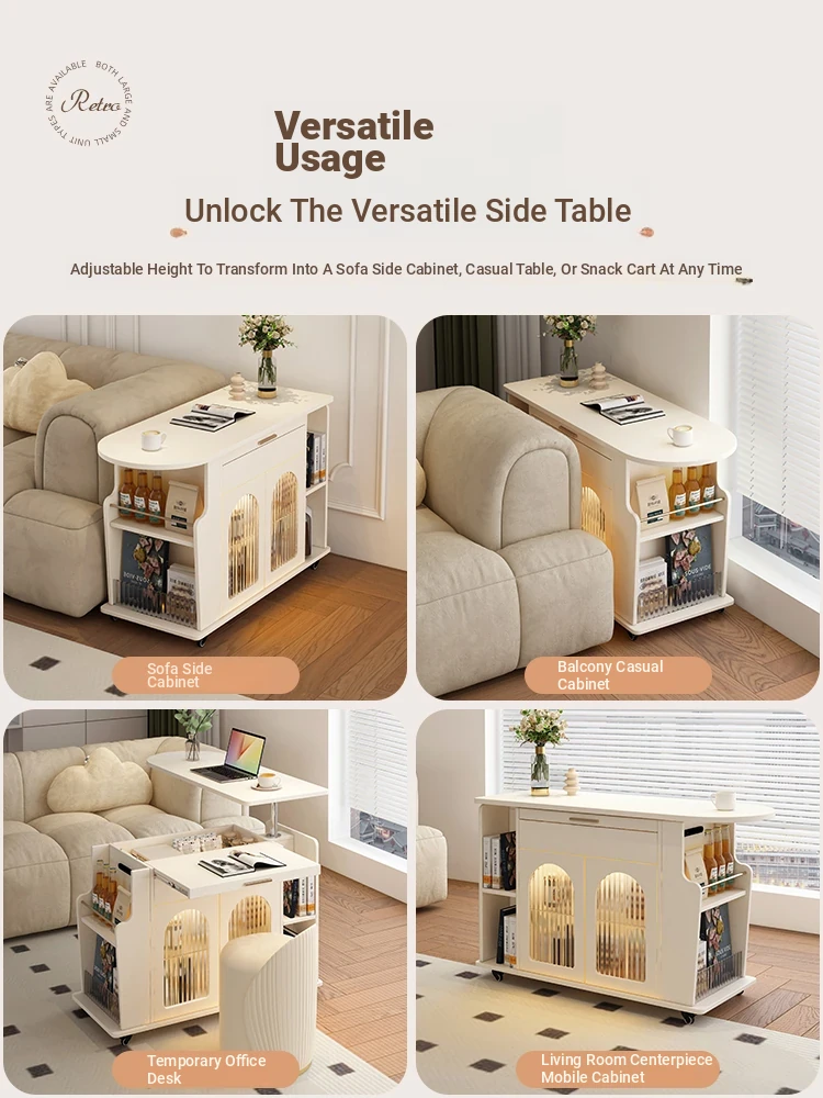 French Cream Style Adjustable Coffee Table: Mobile Tea Trolley End Table for Home, Rotating Sofa Side Cabinet – Perfect for Versatile Living Room Spaces