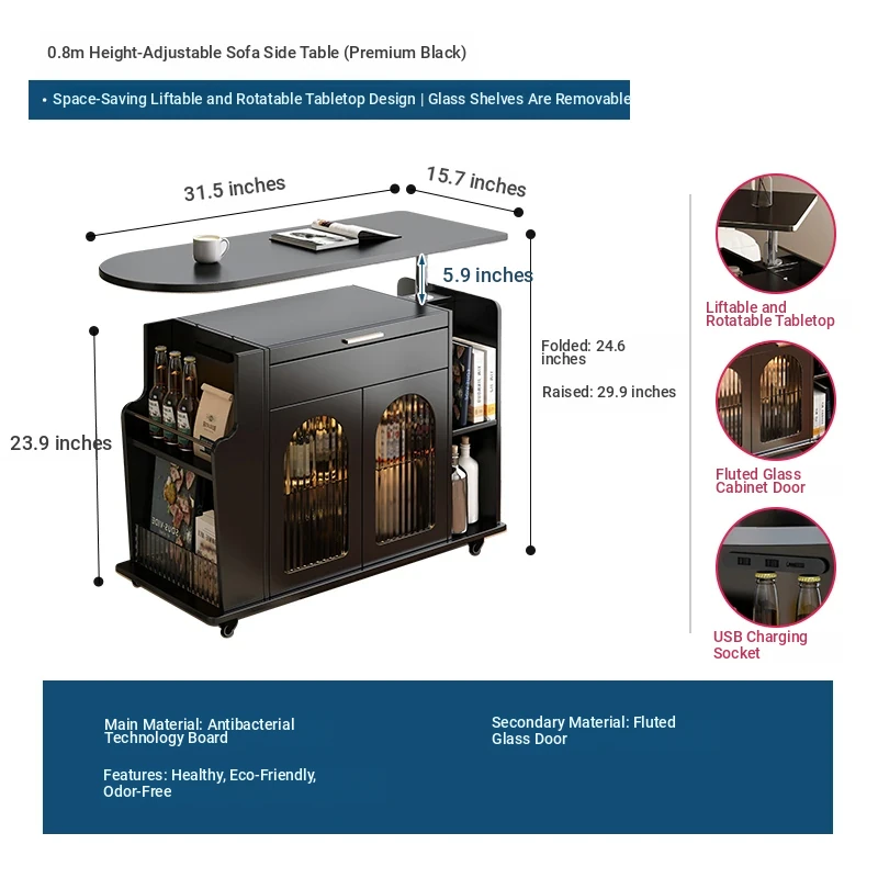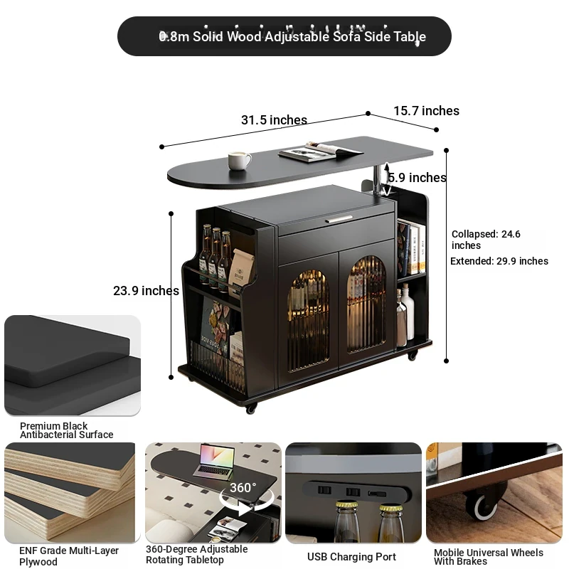 31.50 in solid wood Adjustable sofa side table [five anti-bacterial Classy Black]]