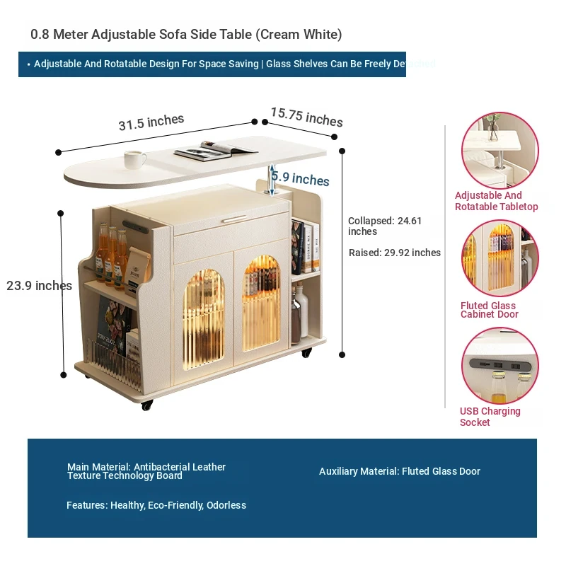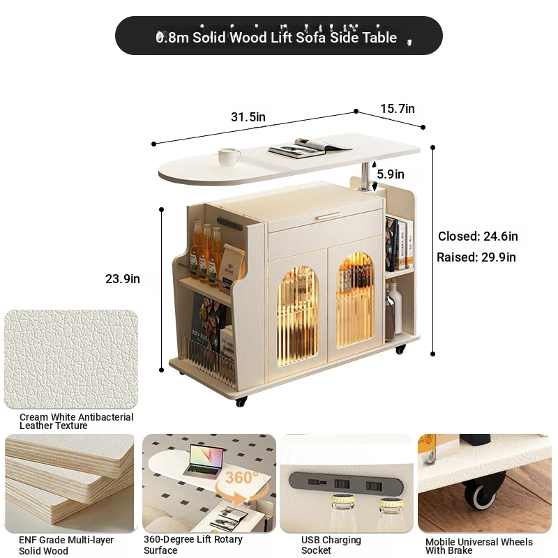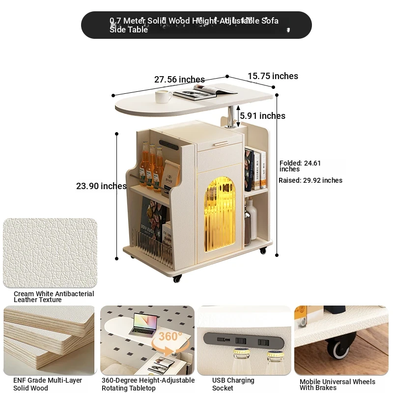 31.50 in solid wood Adjustable sofa side table [five anti skin feeling leather White]]